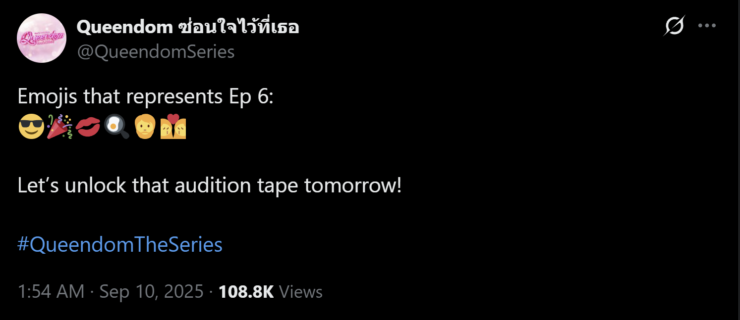 Towards the end of production, I think we only had like one shooting day left. At the same time, we had another GL series that is airing on our platform and it was performing really, really well. So of course, as research, we looked at the data to see which moment drove engagement, like how the numbers were so crazy. What we found was that the relationship in that show progressed quite quickly. They had a kiss or an NC scene by the time it got to episode 3. Immediately there was question that is raised from our team, so when does Rey and Print kiss in Queendom? And my answer was, at the end of episode six. That worried a lot of people because we originally made Queendom to be built as a slow burn and we wanted Rey and Print's relationship to feel believable, for the intimacy to like really land emotionally when it does happen.